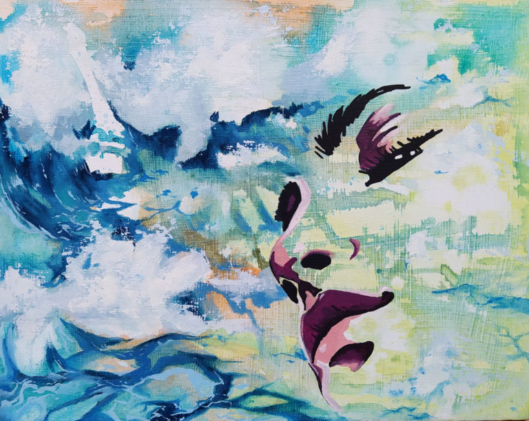 Mixed media painting (acrylics and oils) on wood board. One of a kind.