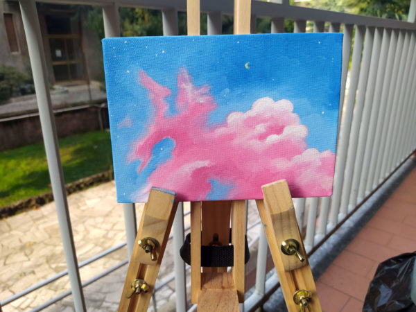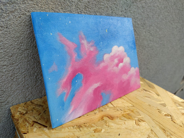 Small original oil painting of a skyscape with pink clouds on a blue starry sky.